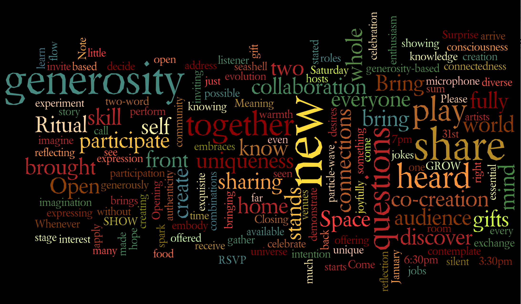 This is a generosity-based event. This means, it is made possible through the generosity of all who attend. Consider what your offer of generosity will be as you show up.